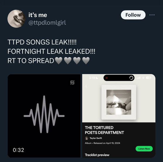 Recently, pop star Taylor Swift’s album, The Tortured Poets Department, was leaked and spread like wildfire on various social media platforms days ahead of its official release. Naturally, fans and non-fans took to social media. Some indulged in listening to the leaked material, while others expressed their discontent with the sharing of the leak.